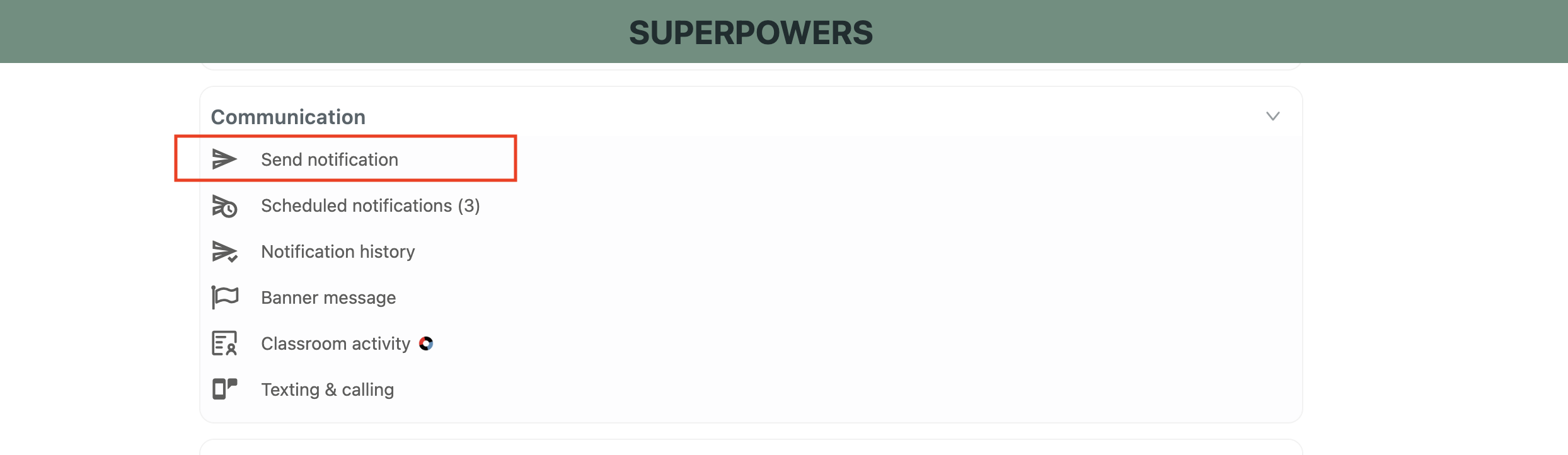 - En tus Superpoderes Administrativos ⚡, ve a Comunicación → Enviar Notificación.