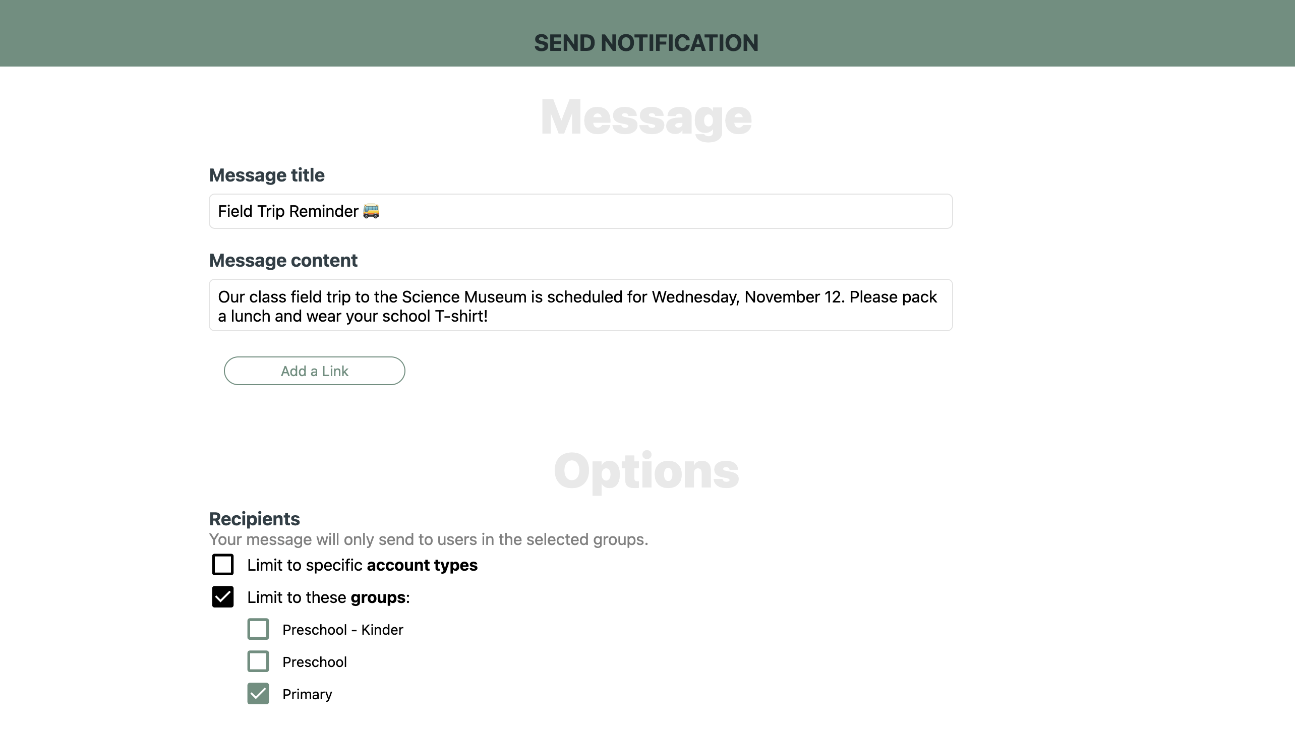 La función de Notificación Programada te permite establecer recordatorios o anuncios para que se envíen automáticamente en un momento posterior. Esto es perfecto para enviar recordatorios antes de eventos escolares, fechas límite o actividades próximas, sin tener que enviarlos manualmente.
