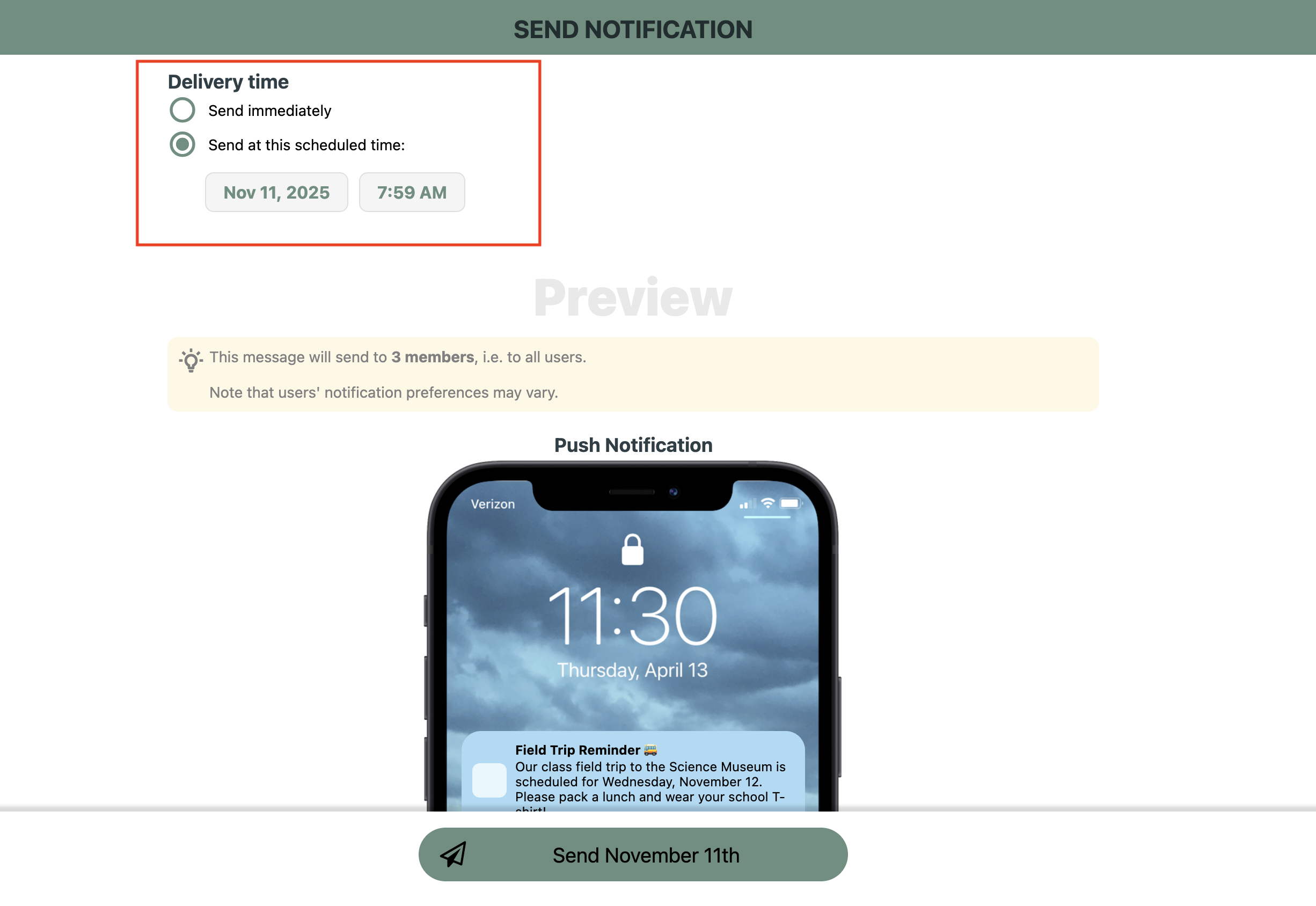 - Haz clic en Enviar Notificación — se entregará automáticamente a la hora programada.